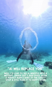 “AI will replace you.Well, I’d love to see AI wrestle into a wetsuit, smash out 3 deep dives, blow a perfect bubble ring at the safety stop & still make